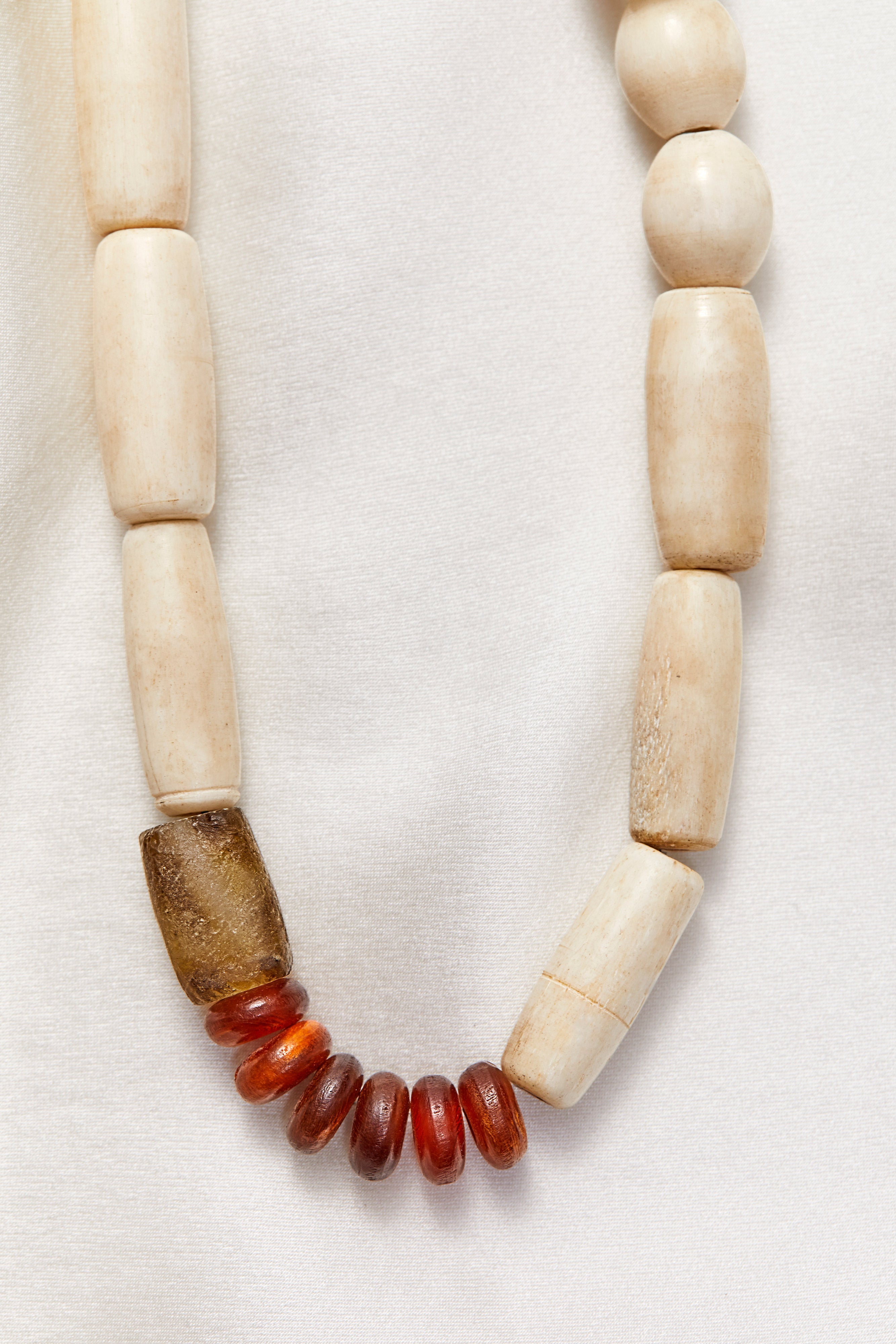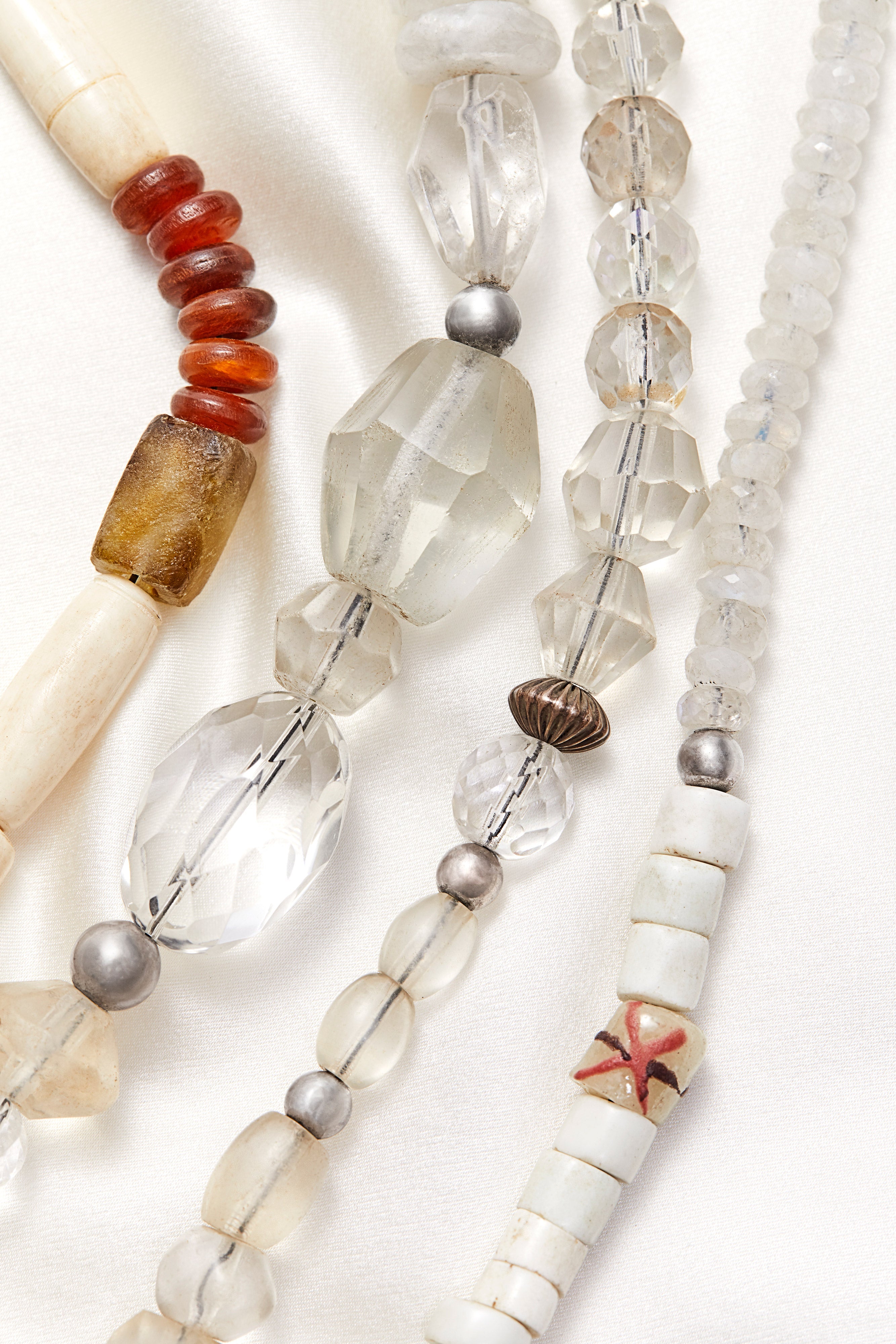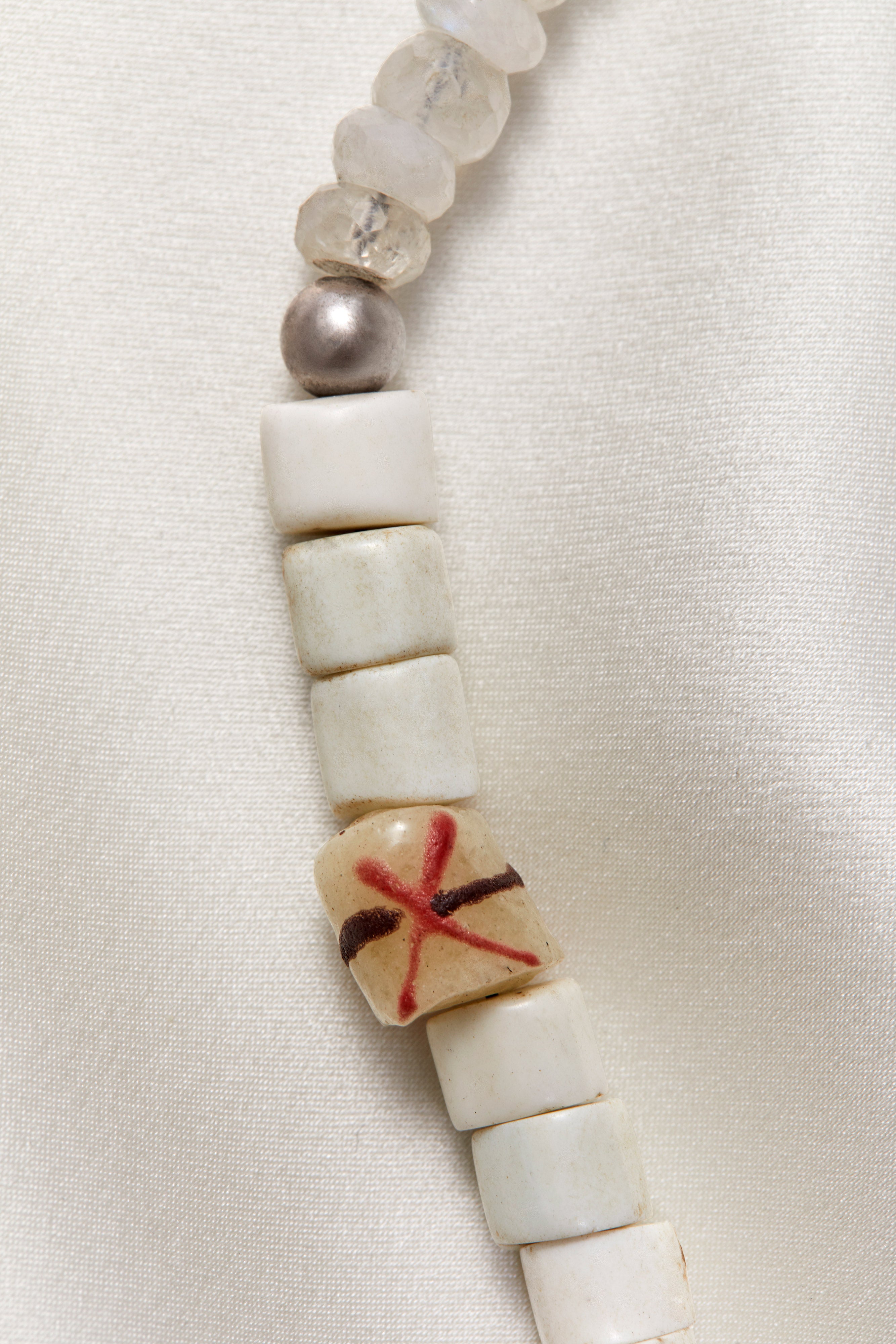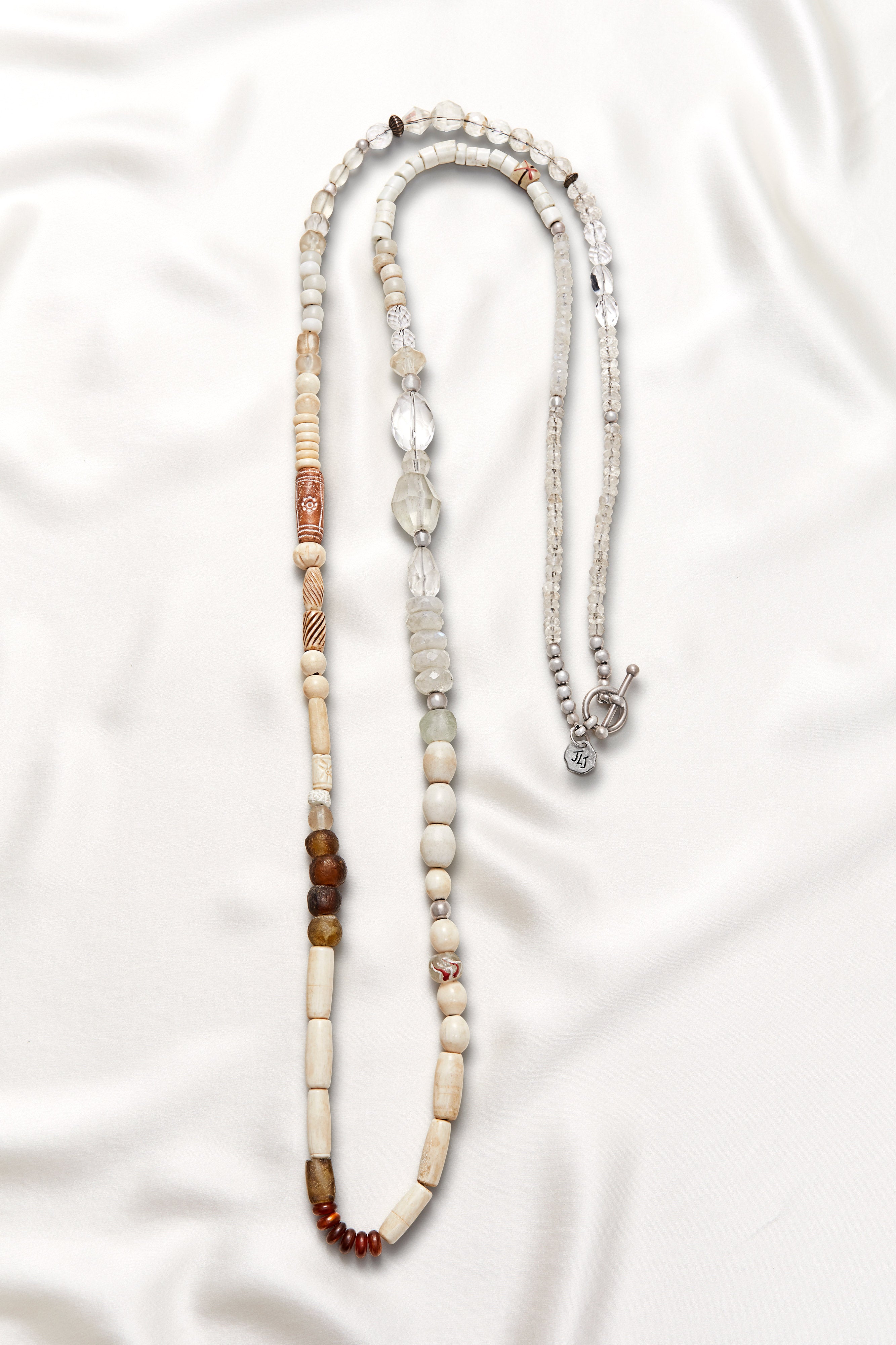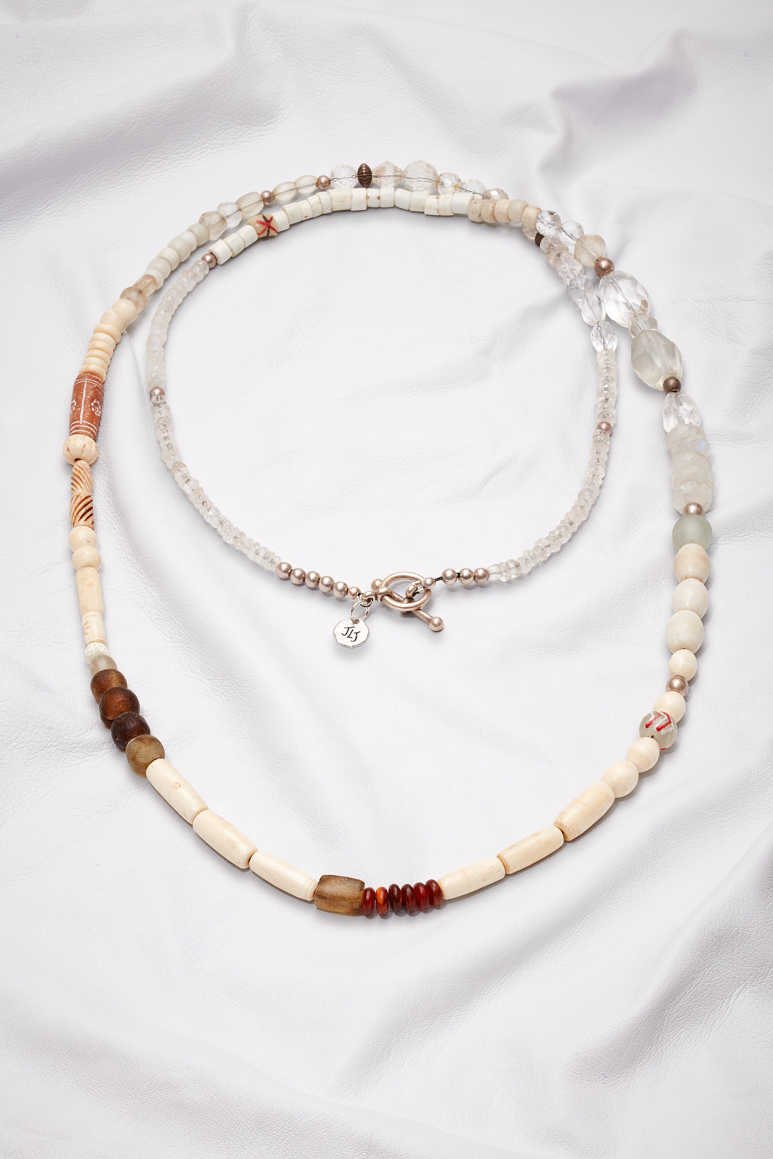 • CRYSTAL QUARTZ, RAINBOW MOONSTONE, VINTAGE AFRICAN BEADS, BONE, HORN, CLAY, GLASS