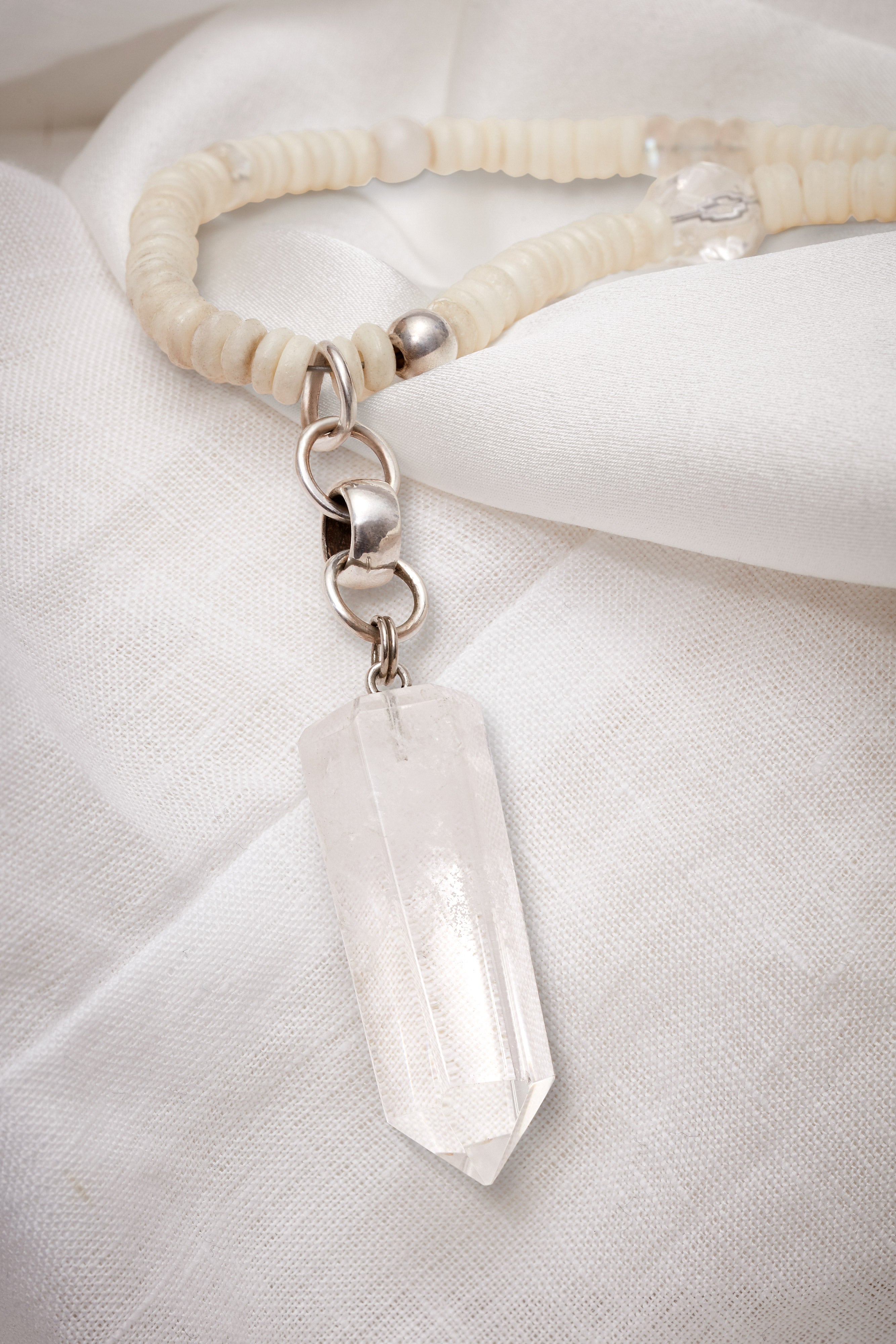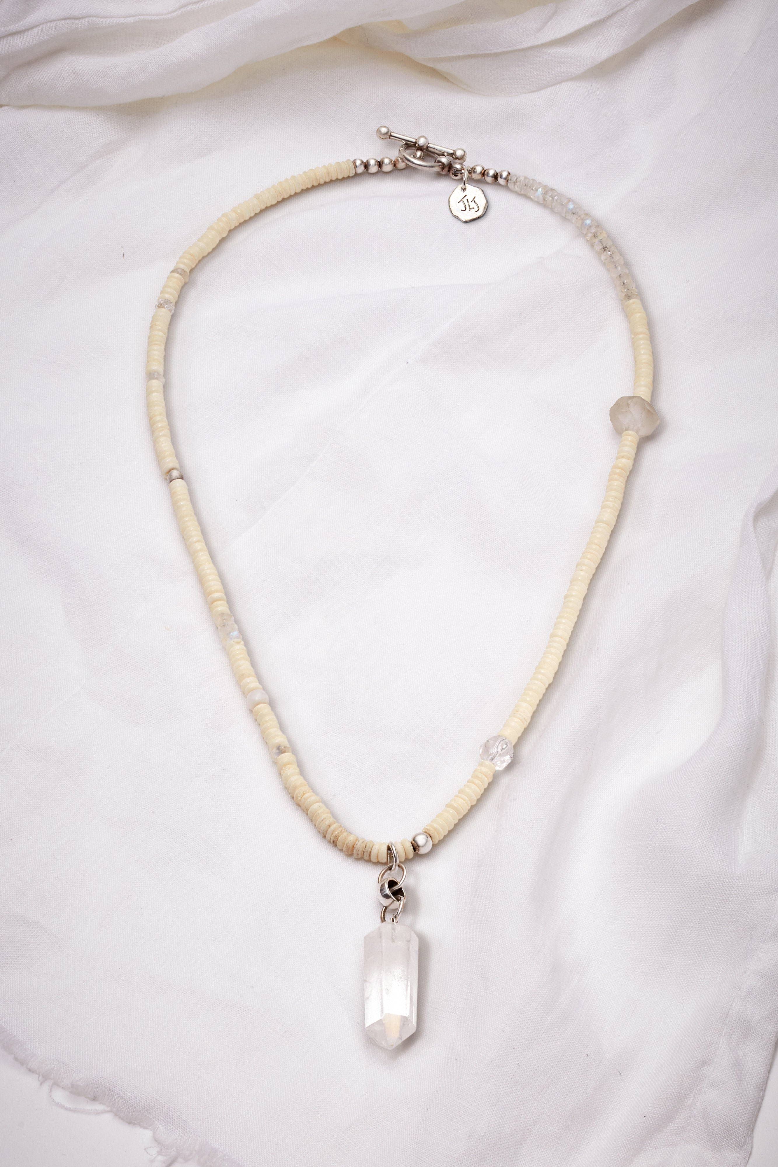 • RAINBOW MOONSTONE, BONE, CRYSTAL QUARTZ, VINTAGE AFRICAN BEADS, CRYSTAL QUARTZ PENDANT